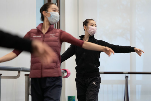 Some Shanghai Ballet dancers resume training following their 14-day quarantine as they'd returned from a US tour on Feb 1. [Photo by Gao Erqiang/China Daily] |