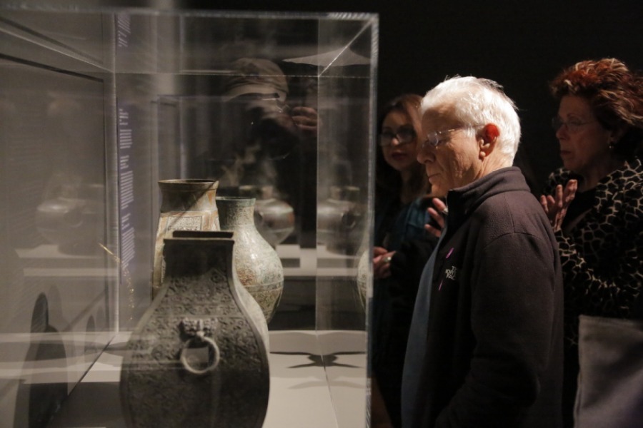 People view Chinese ritual bronzes during a media preview of the exhibition Eternal Offering: Chinese Ritual Bronzes in Houston, Texas, the United States, on Feb 26, 2020.An exhibition of ancient Chinese bronze artworks will be on display from Feb 29 to Aug 9 at Asia Society Texas Center (ASTC) in Houston, ASTC announced on Wednesday night.[Photo/Xinhua]