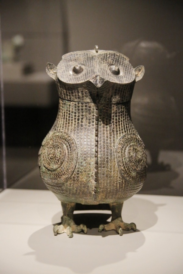 Photo taken on Feb 26, 2020 shows a Zun, or wine vessel, in the shape of an owl at a media preview of the exhibition Eternal Offering: Chinese Ritual Bronzes in Houston, Texas, the United States. An exhibition of ancient Chinese bronze artworks will be on display from Feb 29 to Aug 9 at Asia Society Texas Center (ASTC) in Houston, ASTC announced on Wednesday night.[Photo/Xinhua] |