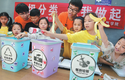 Two college student volunteers from Jiangsu University guide children in Zhenjiang in 2019 to learn to classify and dispose of waste correctly. SHI YUCHENG/FOR CHINA DAILY