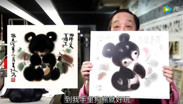 Veteran artist and designer Han Meilin displays a bear cub he painted during a livestreaming course on Feb 20.[Photo provided to China Daily] |
