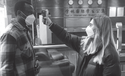 Olya, from Ukraine, a student of Chongqing University, checks another student's temperature at the entrance to their dormitory on Feb 18. WANG QUANCHAO/XINHUA