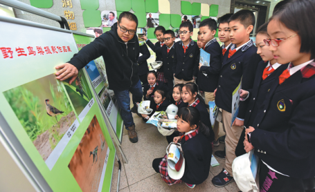 A volunteer introduces the bird species that may appear in the city of Xi'an to a class of primary school students in Xi'an, Shaanxi province, in April 2018. YUAN JINGZHI/FOR CHINA DAILY