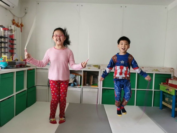 Yang Junyi, 8, and her brother Yang Junyue, 6, jump ropes during a break, and they attend a livestreamed art class. [Photo provided to China Daily] |