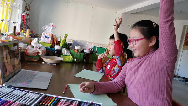 Yang Junyi, 8, and her brother Yang Junyue, 6, jump ropes during a break, and they attend a livestreamed art class. [Photo provided to China Daily] |