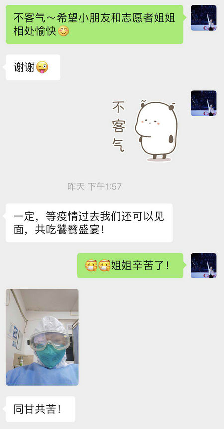 The screenshots of WeChat dialogue between medical-worker parents and student volunteers from Fudan University, who help tutor these medical staffers' children via the internet. Besides Fudan University, other institutions, including the East China Normal University, have also launched similar initiatives. CHINA DAILY |