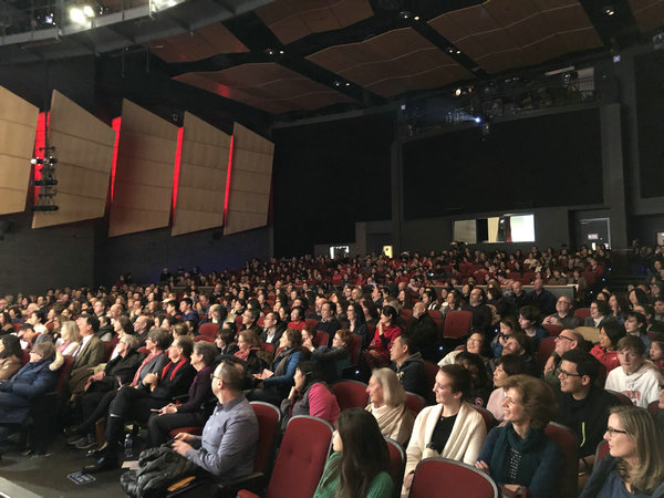 The audience enjoys Appell's show at the school in Boston. |