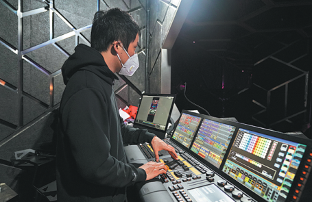 A staff member in a nightclub on Shanghai's Huaihai Road works during a livestream so that followers can enjoy online disco dancing on Friday. WANG XIANG/XINHUA