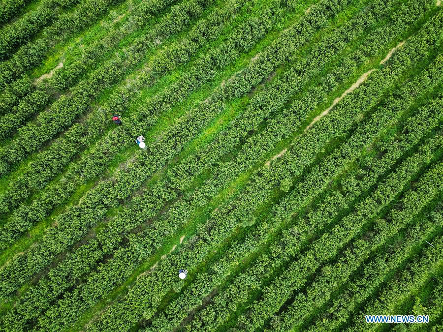 Aerial photo taken on March 16, 2020 shows tea workers picking tea leaves at a tea garden in Dawu county, Central China's Hubei province. [Photo/Xinhua]
