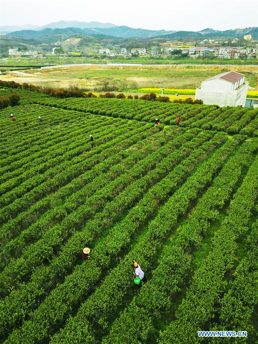 Aerial photo taken on March 16, 2020 shows tea workers picking tea leaves at a tea garden in Dawu county, Central China's Hubei province. [Photo/Xinhua]