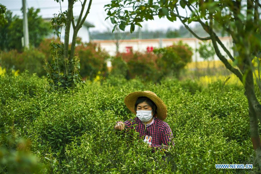 A tea worker picks tea leaves at a tea garden in Dawu county, Central China's Hubei province, March 16, 2020. [Photo/Xinhua]
