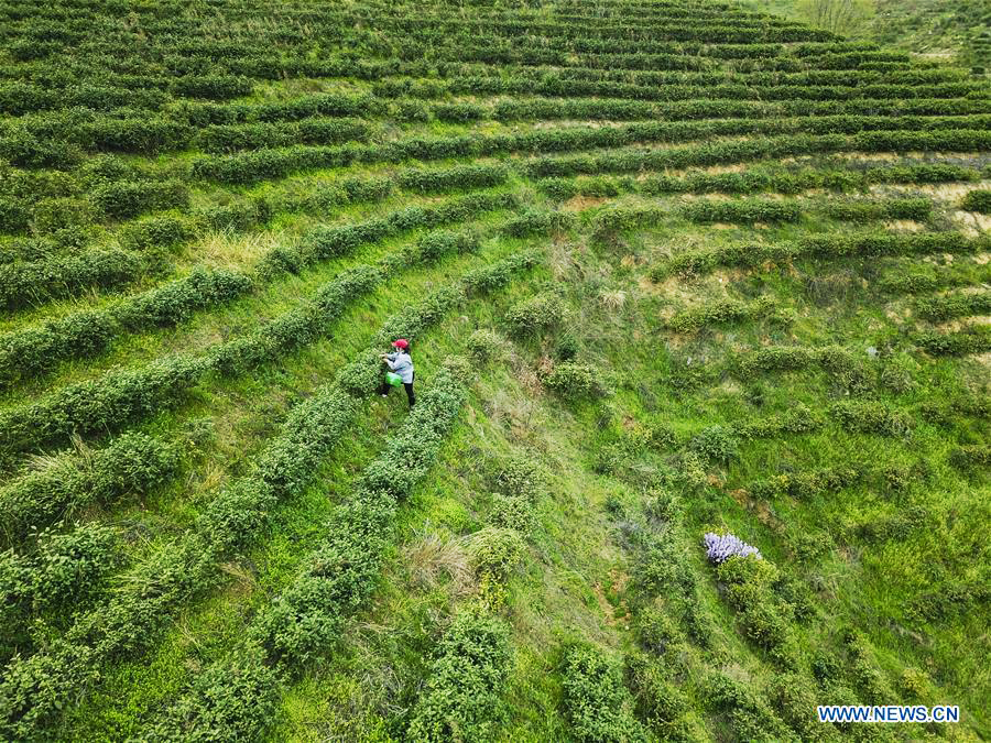 Aerial photo taken on March 16, 2020 shows a tea worker picking tea leaves at a tea garden in Dawu county, Central China's Hubei province. [Photo/Xinhua]