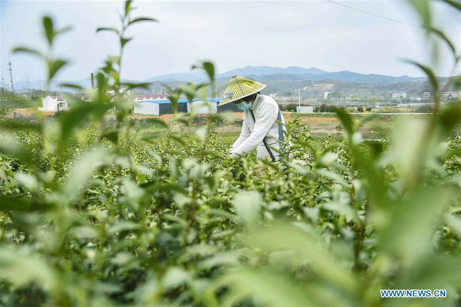A tea worker picks tea leaves at a tea garden in Dawu county, Central China's Hubei province, March 16, 2020. [Photo/Xinhua]