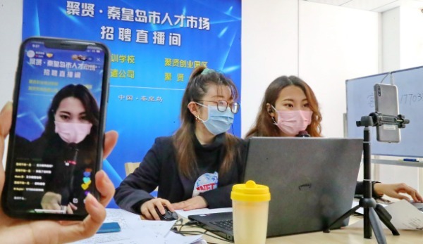 Workers at a talent market in Qinhuangdao, Hebei province, livestream to offer positions for job seekers.[Photo by Cao Jianxiong/For China Daily] |