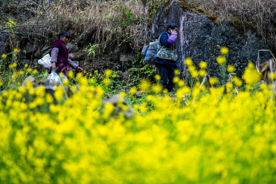 Yan Fugao and his wife Wang Daxiang from Luoqiu village, Yongshan county, Yunnan province, head to the village entrance to take a bus.[Photo by Jiang Wenyao/Xinhua] |