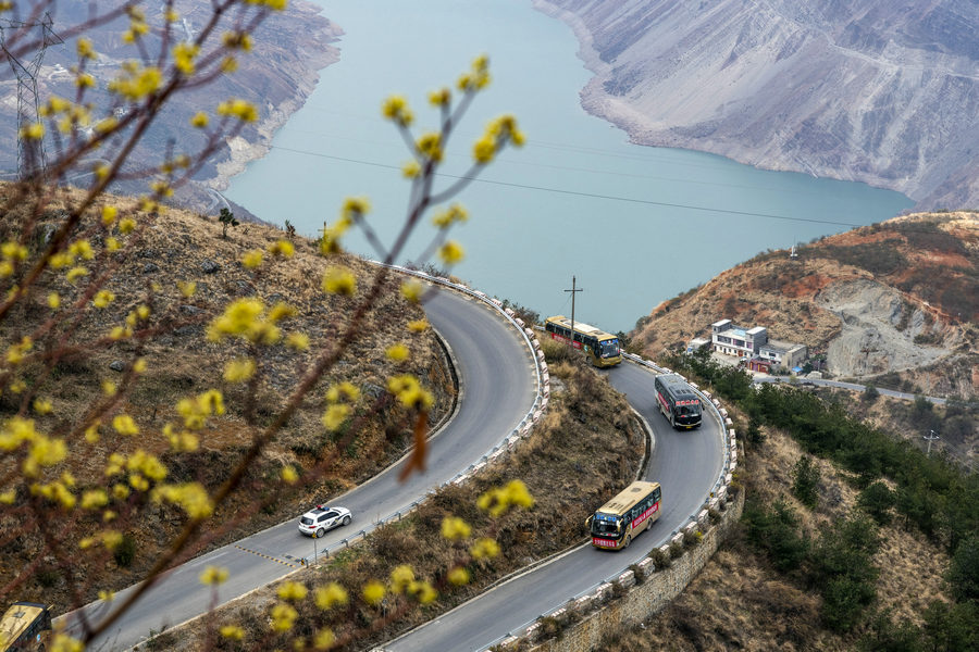 Home-moving vans led by the police car set off from Daxing town to Maojiawan, the poverty alleviation resettlement area in Ludian county.[Photo by Jiang Wenyao/Xinhua]