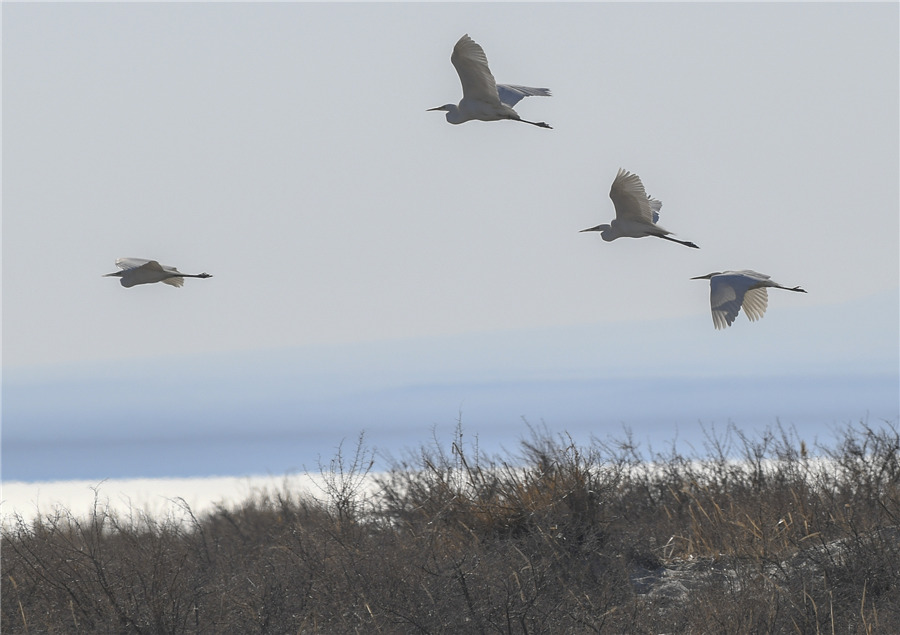 This spring, migratory birds have arrived at Ulungur Lake, known as "the sea in the Gobi", in Northwest China's Xinjiang Uygur autonomous region, on March 28, 2020. The area, now a national wetland park, has been a sanctuary for many water bird species. [Photo/Xinhua]