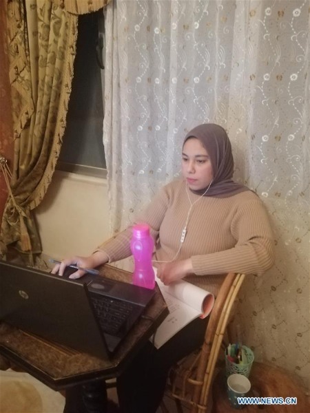 Rawan Ahmed, an Egyptian student of Confucius Institute of Suez Canal University, learns Chinese during online classes in Ismailia, Egypt on March 22, 2020. To control the spread of the novel coronavirus, the Egyptian government temporarily suspended schools, universities and all classes, halted flights and closed museums and archeological sites nationwide.[Photo/Xinhua] |