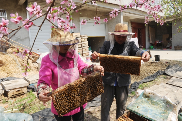 Beekeeper Liu Chunyou and his daughter-in-law examine the condition of their bees in Fuyang, Anhui province, on March 24.[Photo provided to China Daily] |