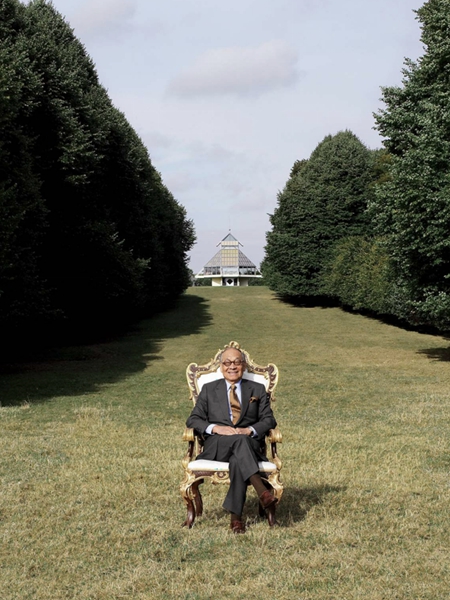 Architect I.M. Pei poses in front of the pavilion he designed in Keswick's garden.[Photo provided to China Daily] |