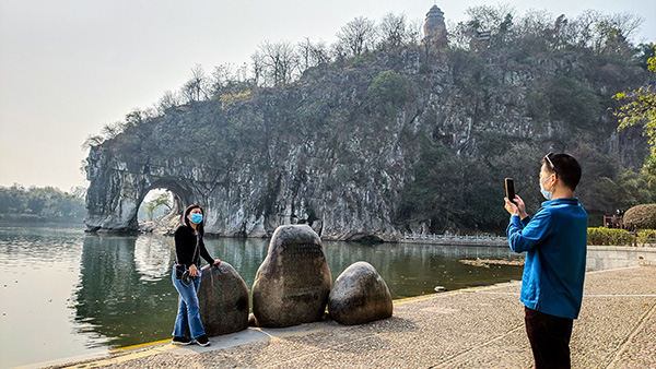 Tourists from Guangdong province pose for a photo in front of the Xiangshan tourism area in Guilin, Guangxi Zhuang autonomous region, which partially reopened on Feb 26. [Photo by Yang Zongsheng/China News Service]