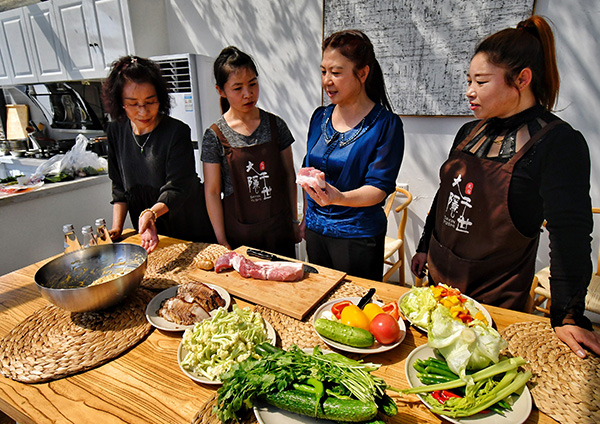Villagers study cooking to provide better service at homestays in Houheilongmiao village, Yanqing district of Beijing, on April 28, 2018. [Photo by Li Xin/Xinhua] |