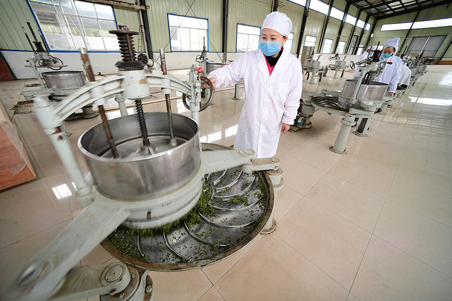 Yang watches over tea leaves placed in a processing machine. [Photo by Yang Ying/Xinhua]