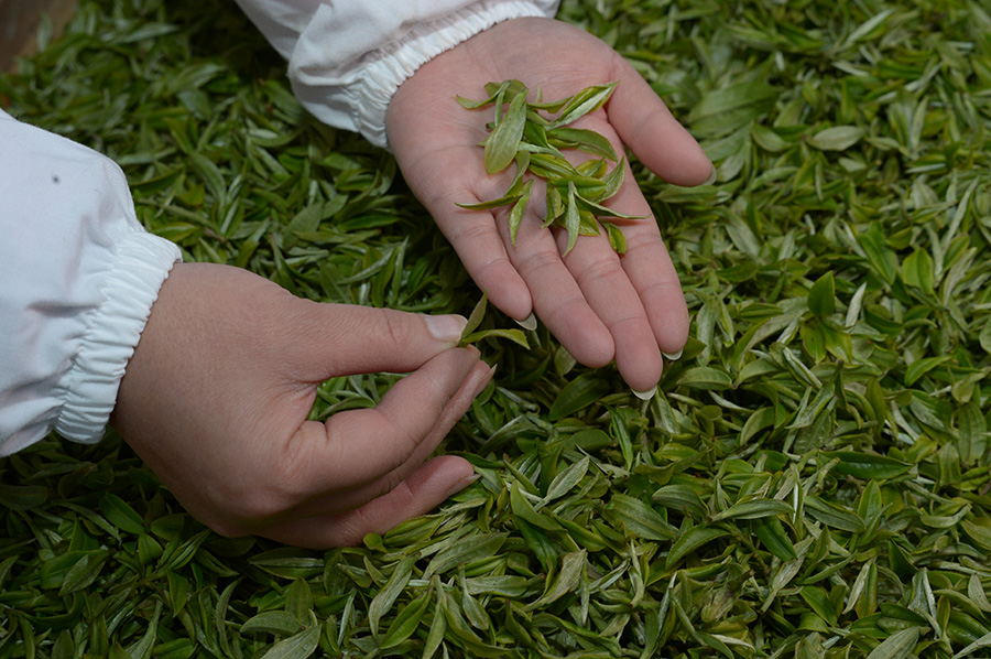 Yang displays freshly picked tea leaves. [Photo by Yang Ying/Xinhua]