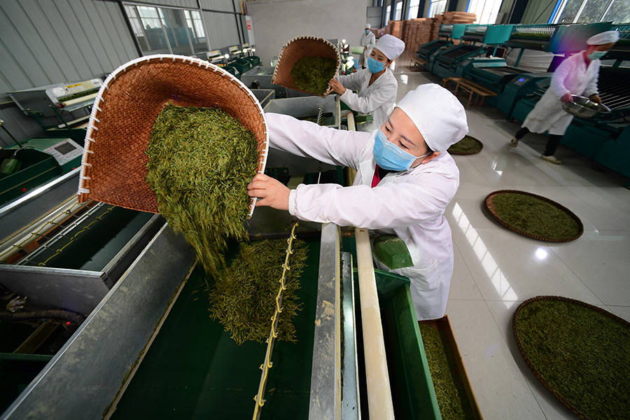 Yang pours tea leaf mix onto a processing belt with workers in the Huayang tea company workshop on March 6. [Photo by Yang Ying/Xinhua]