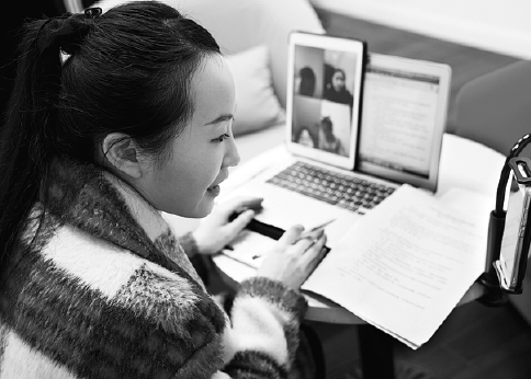 A primary school teacher interacts with her students via online platforms at home in Shanghai on Feb 25. [Photo by Liu Ying/Xinhua] |