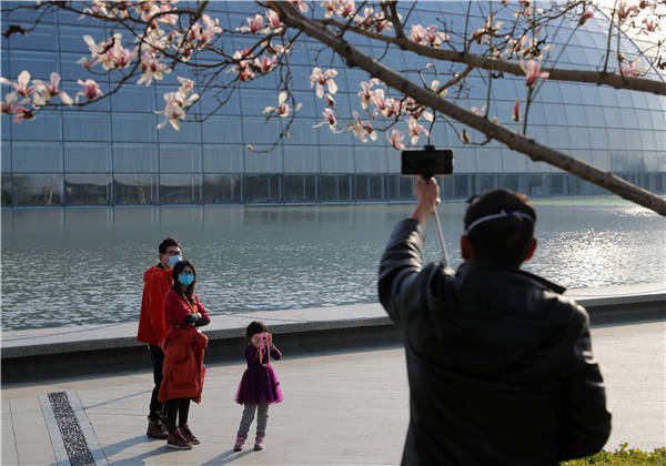 A visitor takes selfies under a flowering magnolia tree at the National Grand Theater in Beijing on March 11. [Photo by Zeng Jia/For China Daily] |