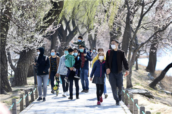All wearing face masks, tourists flock to the Summer Palace in Beijing to enjoy the flowers on March 22. [Photo by Zou Hong/China Daily] |
