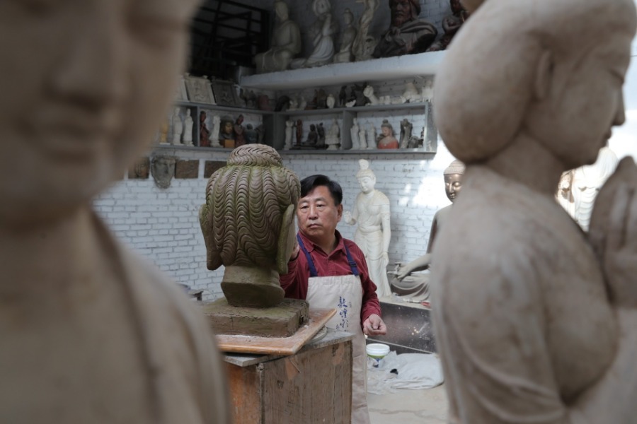 Painted sculpture artist Du Yongwei creates a clay model before painting in Dunhuang, Northwest China's Gansu province, April 5, 2020. Painted sculpture art is a traditional art form in Dunhuang and the craftsmanship has been inscribed in the provincial cultural heritage list of Gansu. Du Yongwei, 60, has been working in the field for over 40 years. He has started training class for youngsters to learn the art.[Photo/Xinhua]