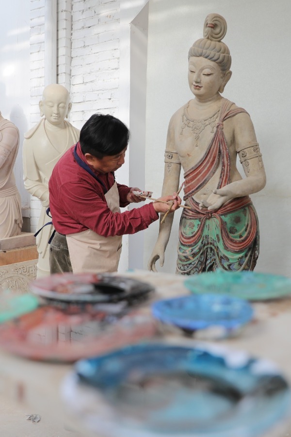 Painted sculpture artist Du Yongwei paints a sculpture in Dunhuang, Northwest China's Gansu province, April 5, 2020. Painted sculpture art is a traditional art form in Dunhuang and the craftsmanship has been inscribed in the provincial cultural heritage list of Gansu. Du Yongwei, 60, has been working in the field for over 40 years. He has started training class for youngsters to learn the art.[Photo/Xinhua] |