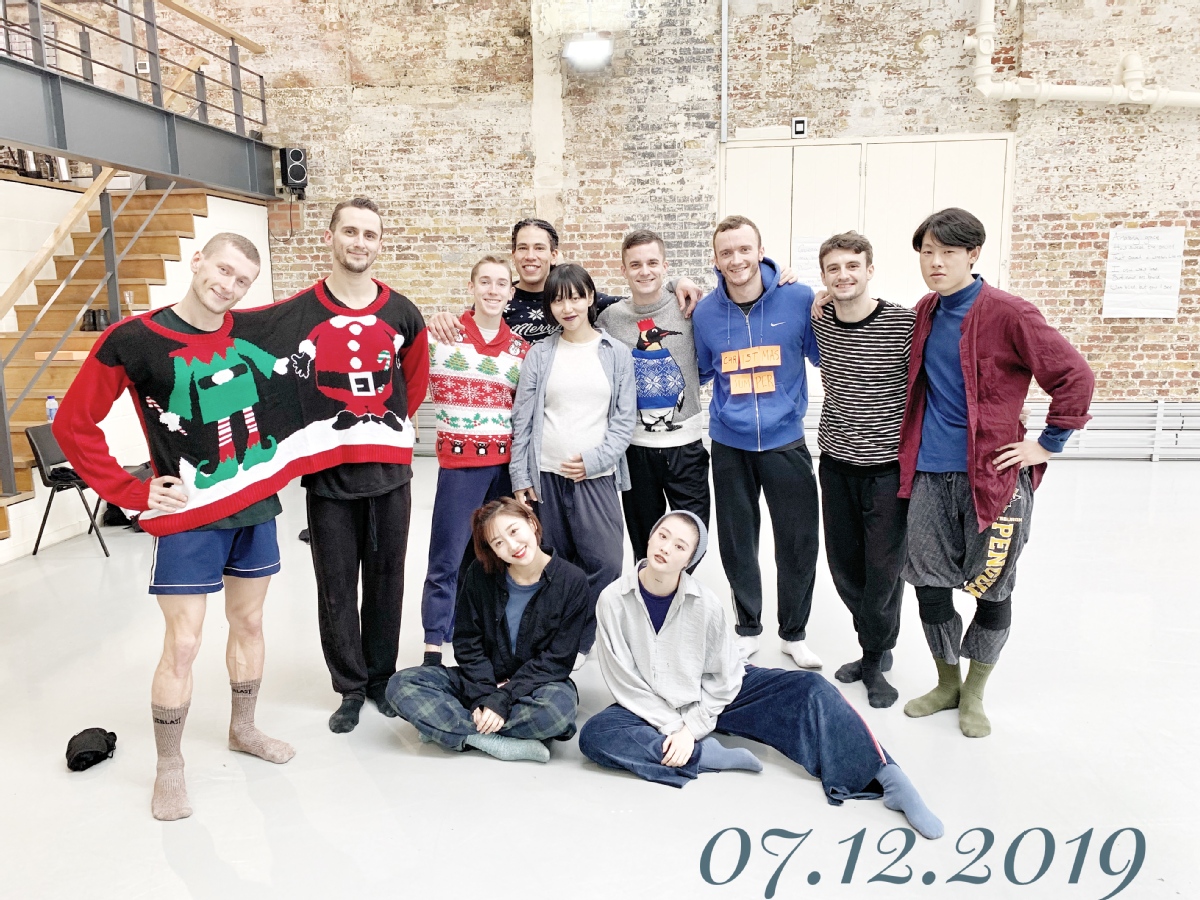 A pregnant Xie (center) and her colleagues pose with the BalletBoyz in 2018. [Photo provided to China Daily] |