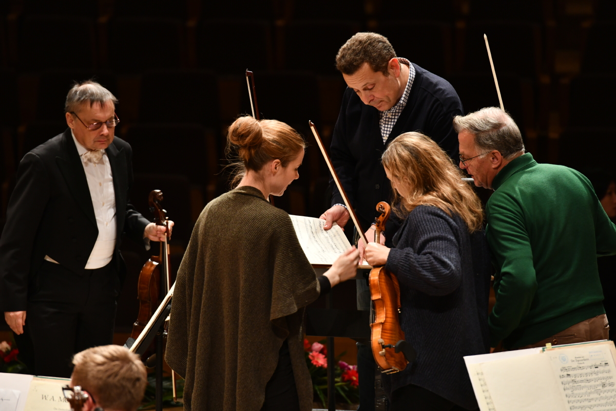 Musicians from Wiener Symphoniker exchange views during their rehearsal at the Tianjin Grand Theatre in 2019. [Photo provided to chinadaily.com.cn]