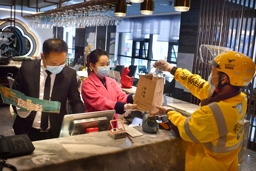 A delivery rider comes to pick up the food in a restaurant.[Photo provided to China Daily] |