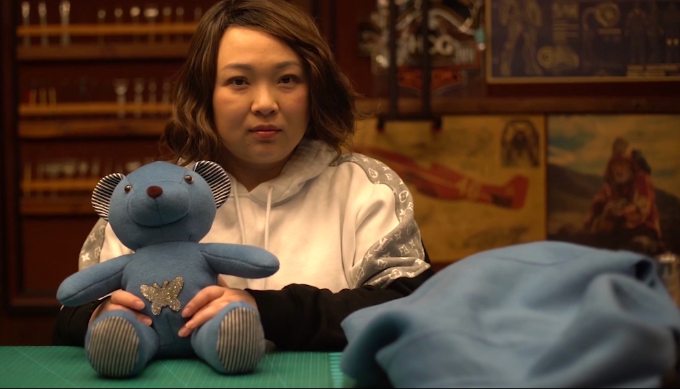 Xiao holds a bear she made. She makes teddy bears from the clothing of departed beloved ones to help soothe the pain of loss. [Photo provided to China Daily] |