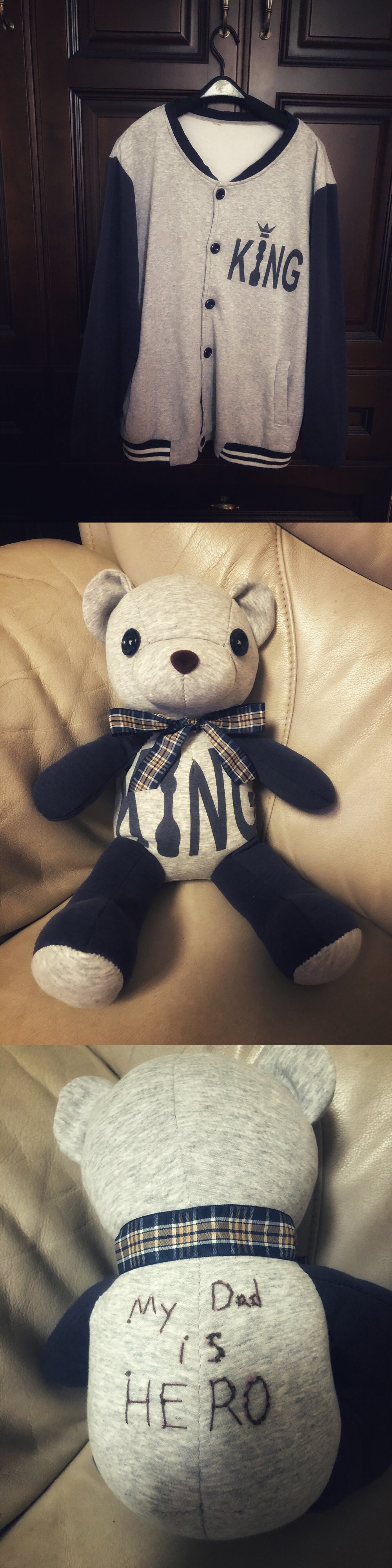 A jacket of policeman Xu Yuelong, who died trying to capture fugitives, is made into a stuffed bear for his son.[Photo provided to China Daily] |