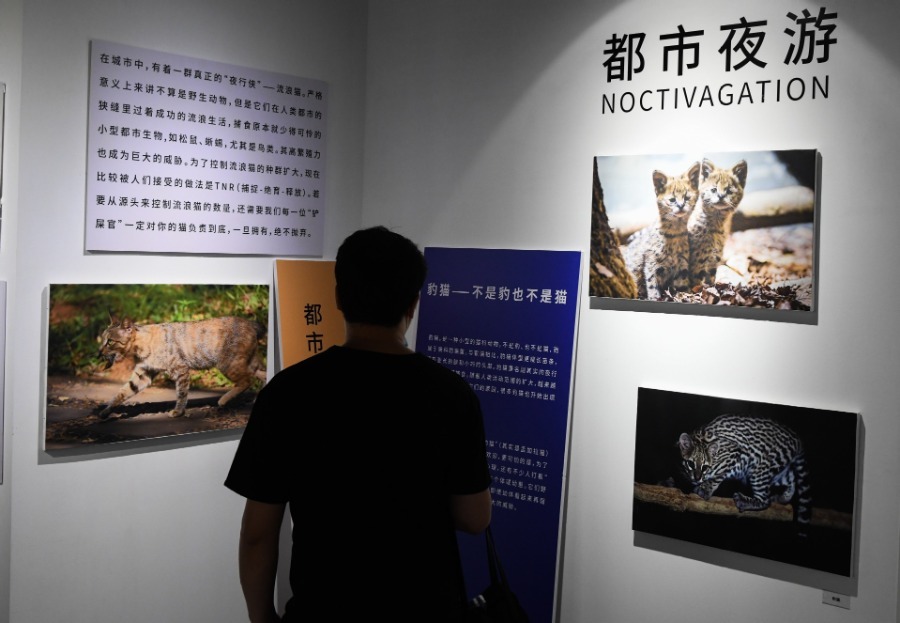 People visit a photography exhibition in Haikou, Hainan province on April 11, 2020. A photo exhibition was recently unveiled in Haikou calling on the public to protect wild animals. All ticket income of the event will be used to purchase infrared trigger cameras to monitor the species, number and distribution of wildlife in the suburban area of Haikou. The exhibition displays nearly 100 photographs and will run through May 10. [Photo/Xinhua]