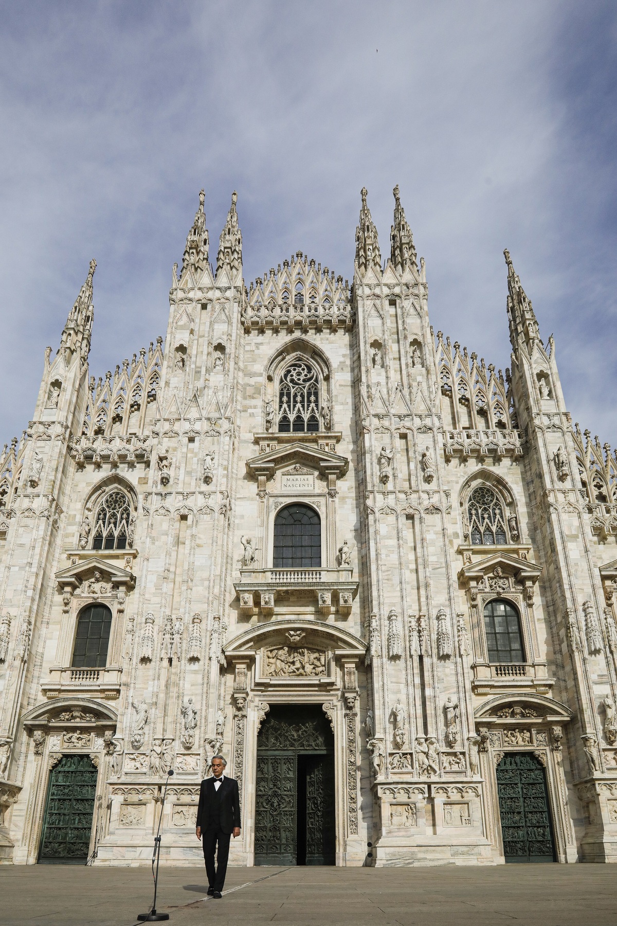 Italian tenor Andrea Bocelli walks in front of an empty Duomo cathedral in Milan, Italy on Easter Sunday as part of a solo concert Music for Hope. [Photo provided to China Daily]