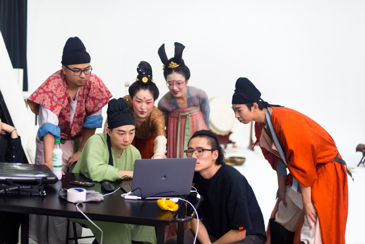 Some members of the studio edit a video together after a performance.[Photo provided to China Daily] |