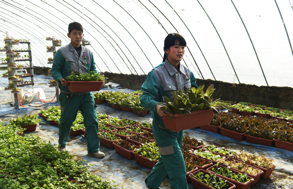The farm's workers carry potted vegetables for sale to urban dwellers. DONG NAIDE/FOR CHINA DAILY |