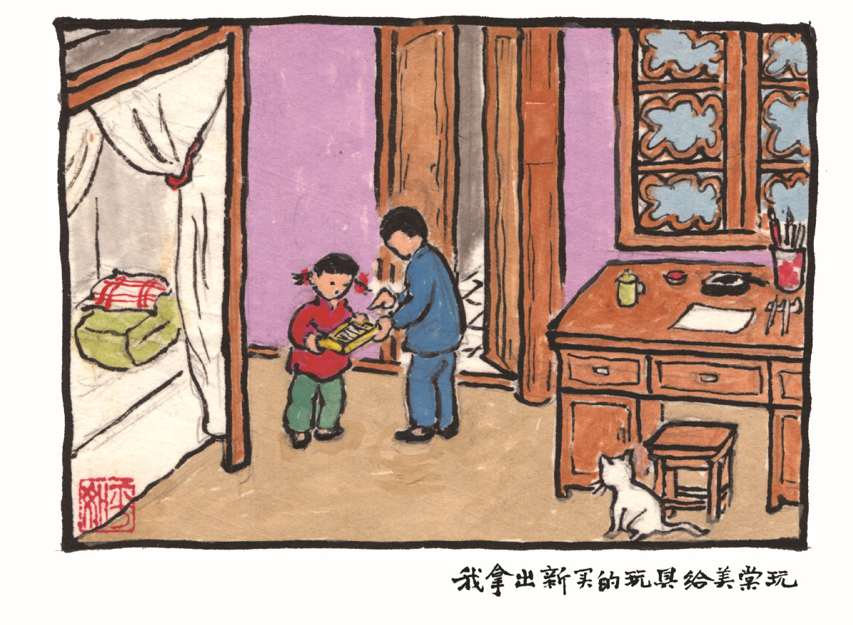 "I bring a new toy to Meitang", as Rao writes as the painting's caption. [Photo provided to China Daily] |
