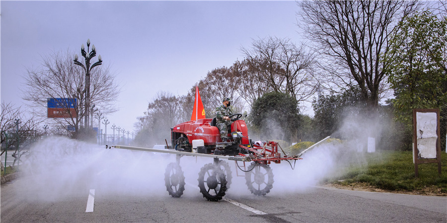 A pesticide spraying machine is used to disinfect the environment in Juntun township, Xindu district, Chengdu, capital city of Sichuan province, on Feb 5. [Photo by Wen Zuopei/For China Daily]