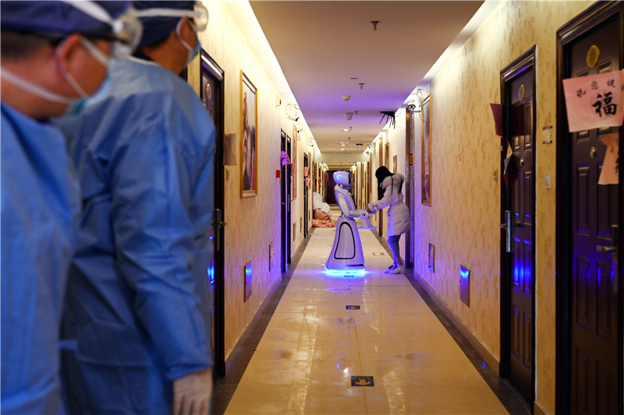 A robot sends food to those quarantined at a hotel in Xinjia sub-district, Nanhu district, Jiaxing city, Zhejiang province, on Feb 22. [Photo by Yang Xiaodong/For China Daily]