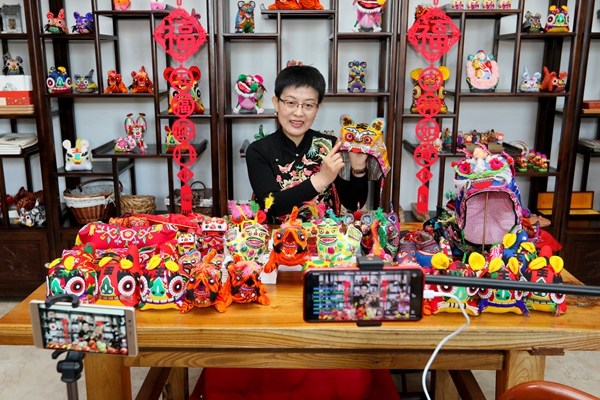 A member from Jiaodong Folk Art Museum in Shandong province's Yantai holds an online training about making tiger-shaped hats, a local handicraft.Photo provided to China Daily] |