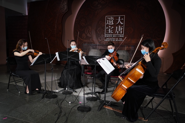 A string quartet of the Xi'an Symphony Orchestra performs during the first of a series of concerts livestreamed on the internet in the Shaanxi History Museum in Xi'an on Saturday.[Photo provided to China Daily]