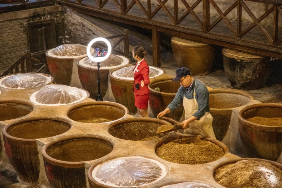 An employee of the Zhenjiang Vinegar Culture Museum illustrates the craft of vinegar-making to audience through livestreaming, Zhenjiang city, Jiangsu province, April 20, 2020. In light of the current epidemic control situation, the museum has chosen to make good use of digital technology, trying to introduce local vinegar culture to people through livestreaming. Zhenjiang is a major vinegar production area in Jiangsu province.[Photo/Xinhua]