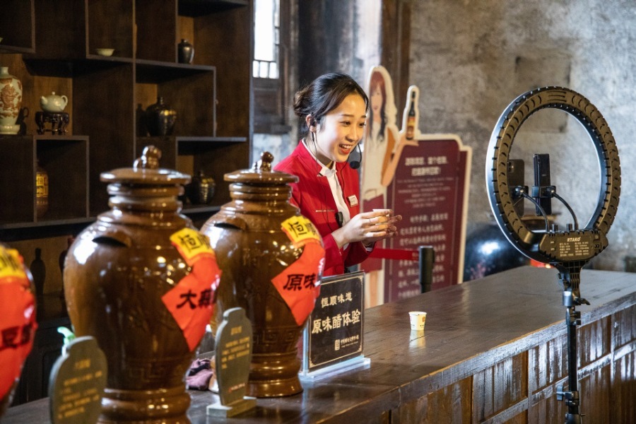 An employee of the Zhenjiang Vinegar Culture Museum illustrates the craft of vinegar-making to audience through livestreaming, Zhenjiang city, Jiangsu province, April 20, 2020. In light of the current epidemic control situation, the museum has chosen to make good use of digital technology, trying to introduce local vinegar culture to people through livestreaming. Zhenjiang is a major vinegar production area in Jiangsu province.[Photo/Xinhua]